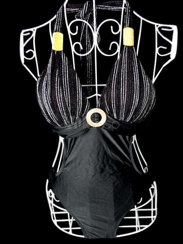 Sexy Black Stripe Lycra Spandex Grommets Women's One Piece Swimsuit On Sale