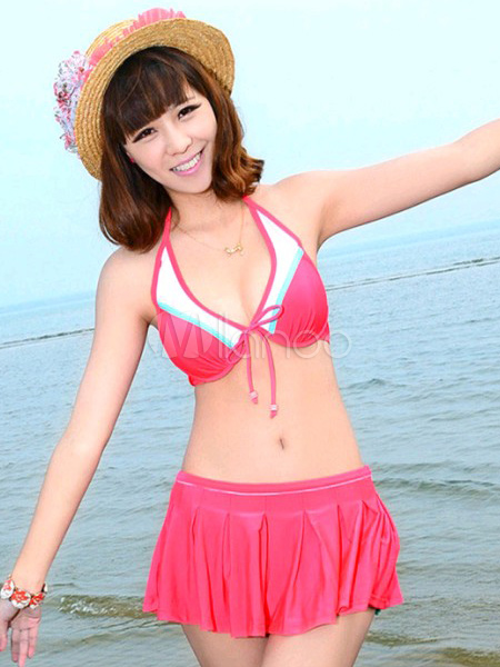 Watermelon Color Block Polyester Skirted Swimsuit For Women On Sale